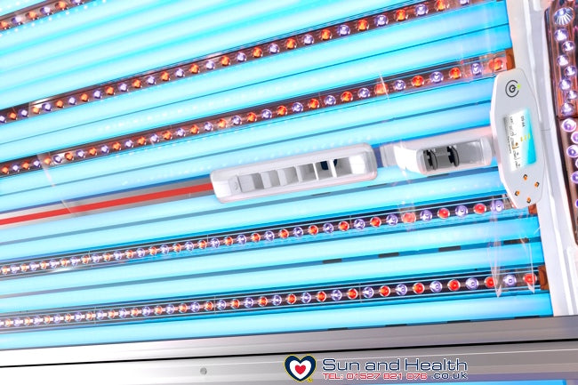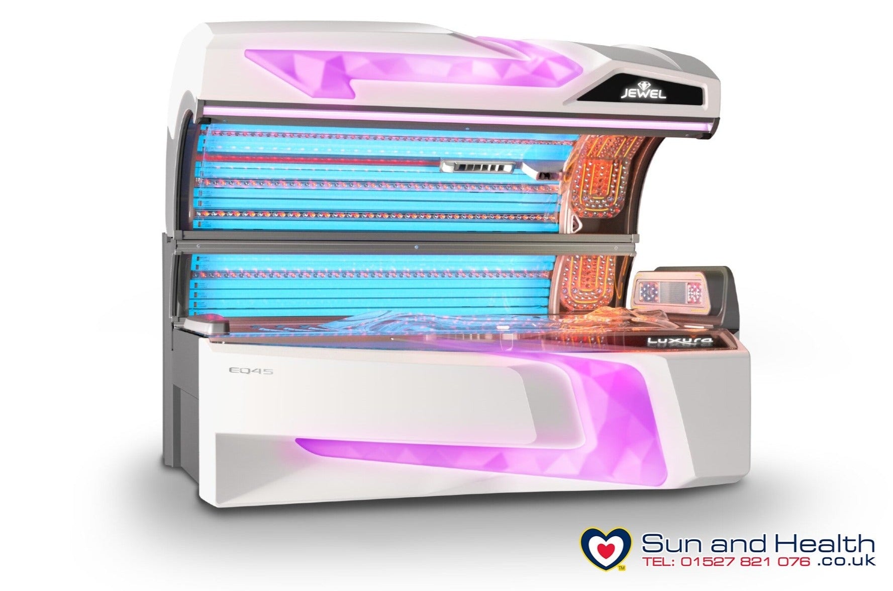 The JEWEL EQ45 is equipped with a total of 454 UV-A PowerLEDs, 18 UV-B PowerLEDs, 331 red LEDs, and 672 yellow micro LEDs. Throughout the entire length, the bench and canopy are equipped with 13 BOS Boosters for a super-fast tanning effect and 33 Premium EQ Intensive 80-100W lamps.